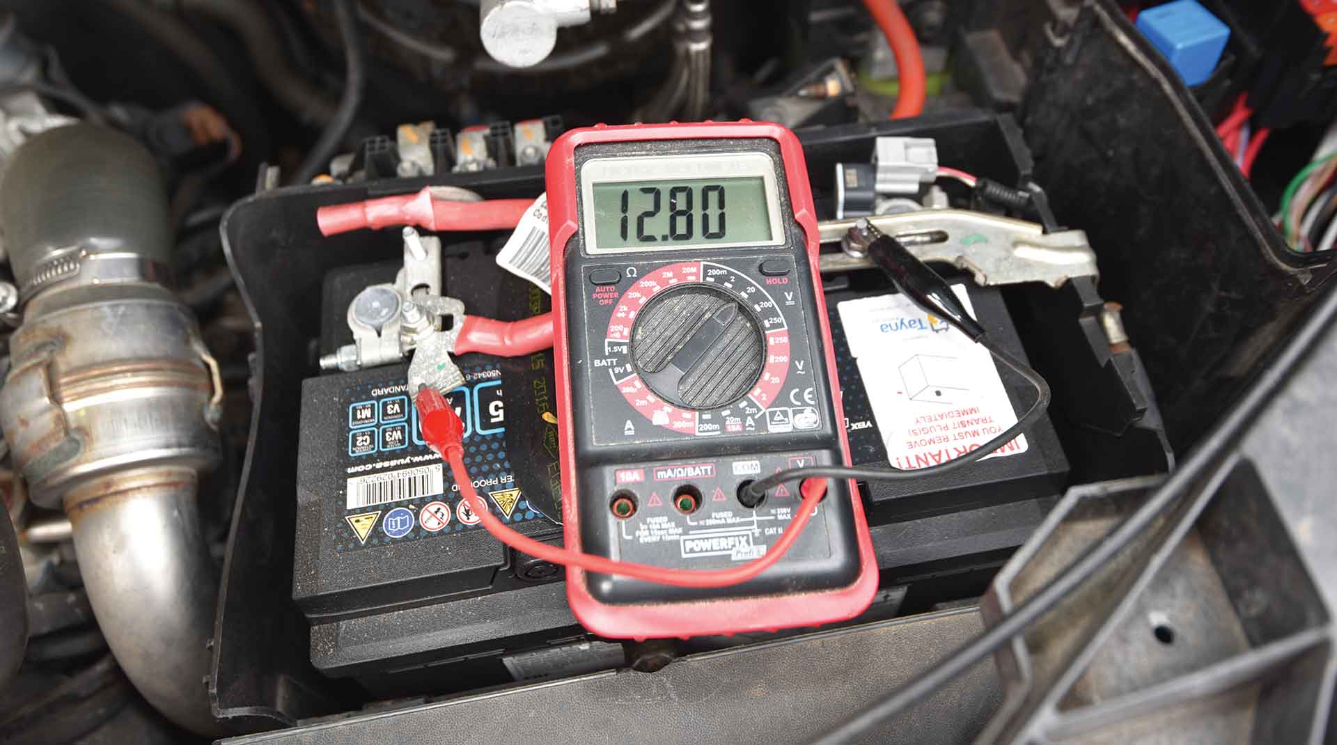 With the battery located, set your multimeter to ‘voltage’, rotate the dial to the 0-20V scale and measure the voltage: 12V is flat, while 12.9V means the battery is fully charged.