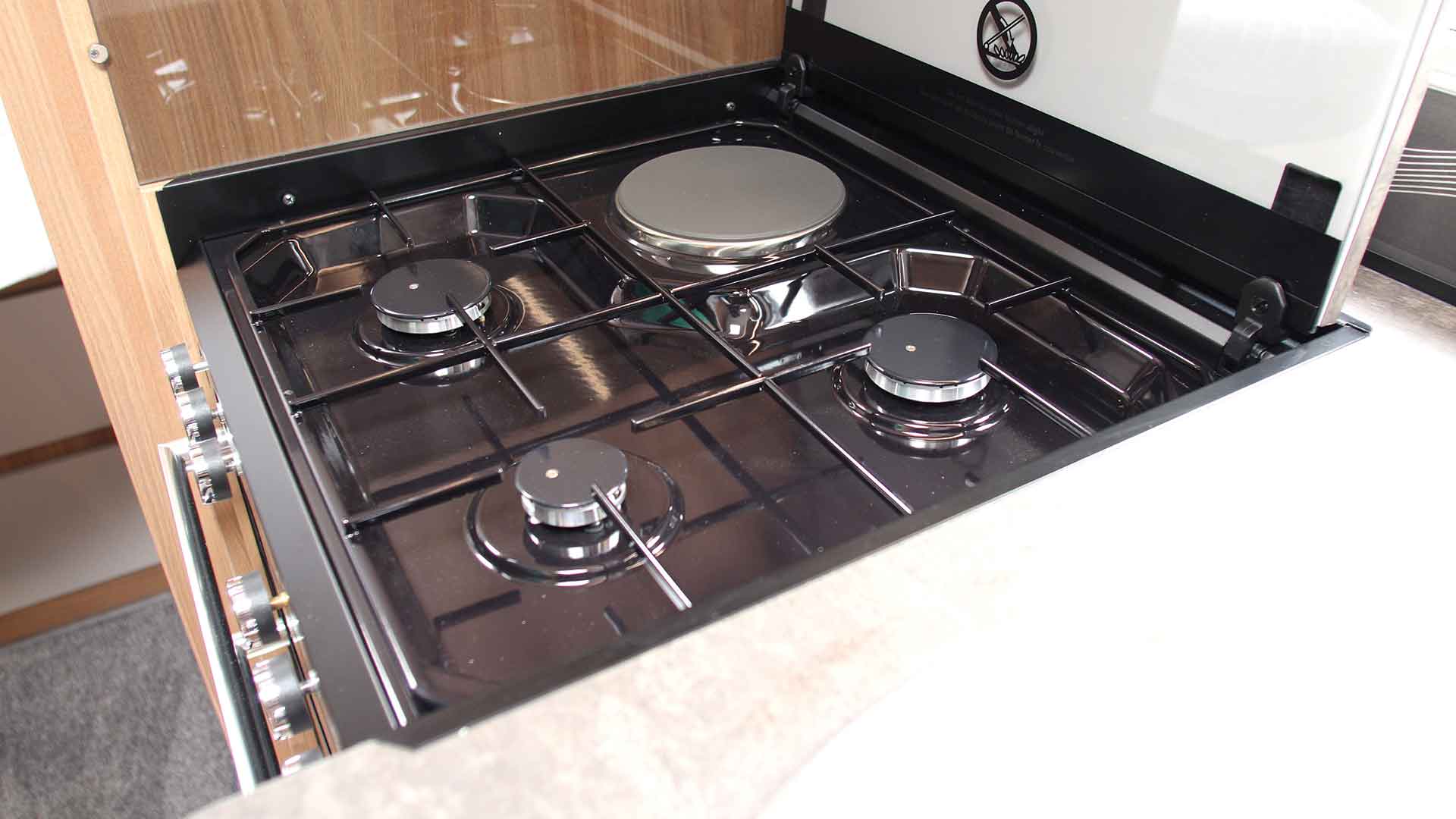 I’d always favour three well-placed and sensibly spaced burners, and I’m also keen on dual-fuel hobs with both electric and gas burners. Typically, these will deliver one electric hotplate and three gas burners, for instance, as seen in the Auto-Sleeper Nuevo EK Plus.