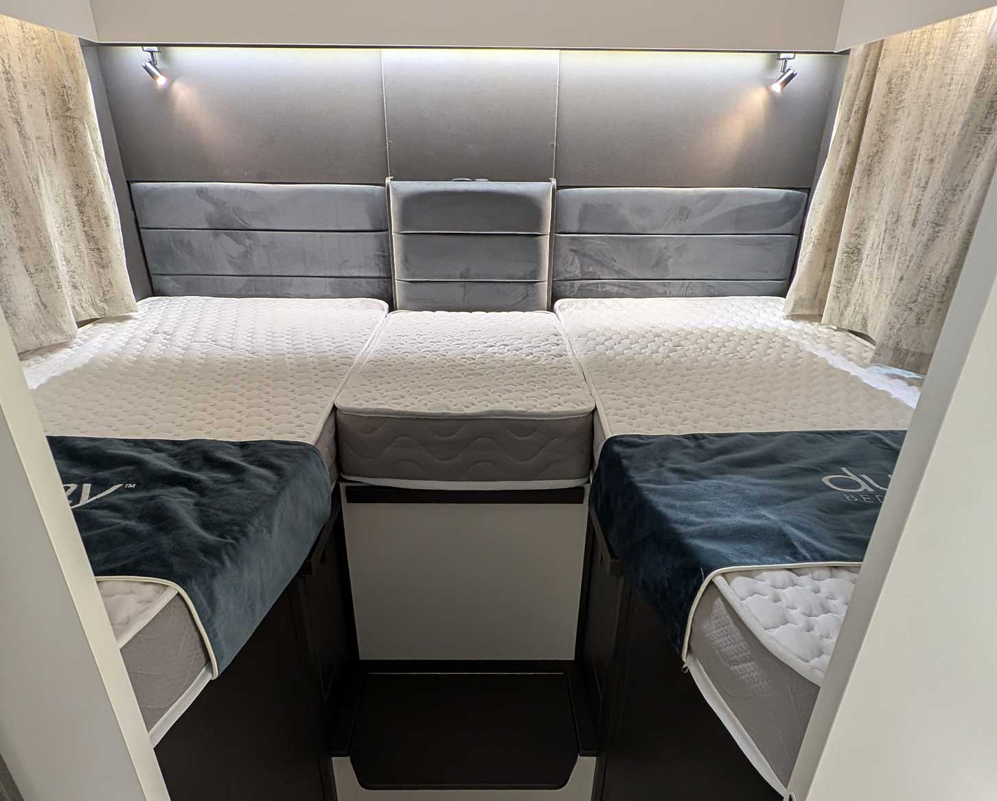 The initial line-up of the entry-level range consists of four 7.8m-long low-profile motorhomes: the island-bed 1500GL, fixed single beds 1500SL, end washroom 1500ET and transverse bed 1500GL. All are based on a Ford Transit, and all, as standard, are two-berths with a foldaway table in the front face-to-face lounge. All bar the 1500ET, however, have a pedestal table as an option that can be lowered to create a second double bed. Prices range from £64,995 to £66,905.