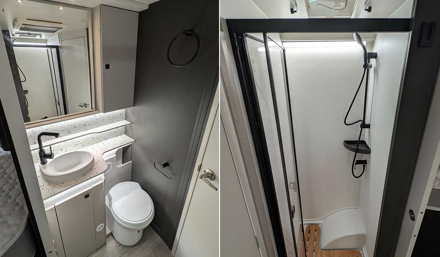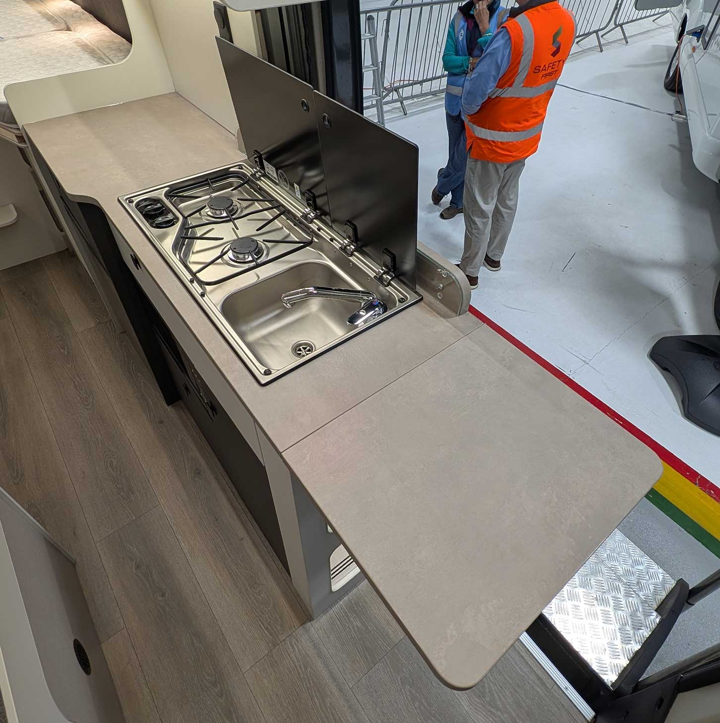 The campervans only have a two-burner hob, but the clip-on table can also be clipped on the outside edge of the kitchen peninsula for al fresco dining. Unusually for an entry-level campervan, the washroom has two drainage holes.