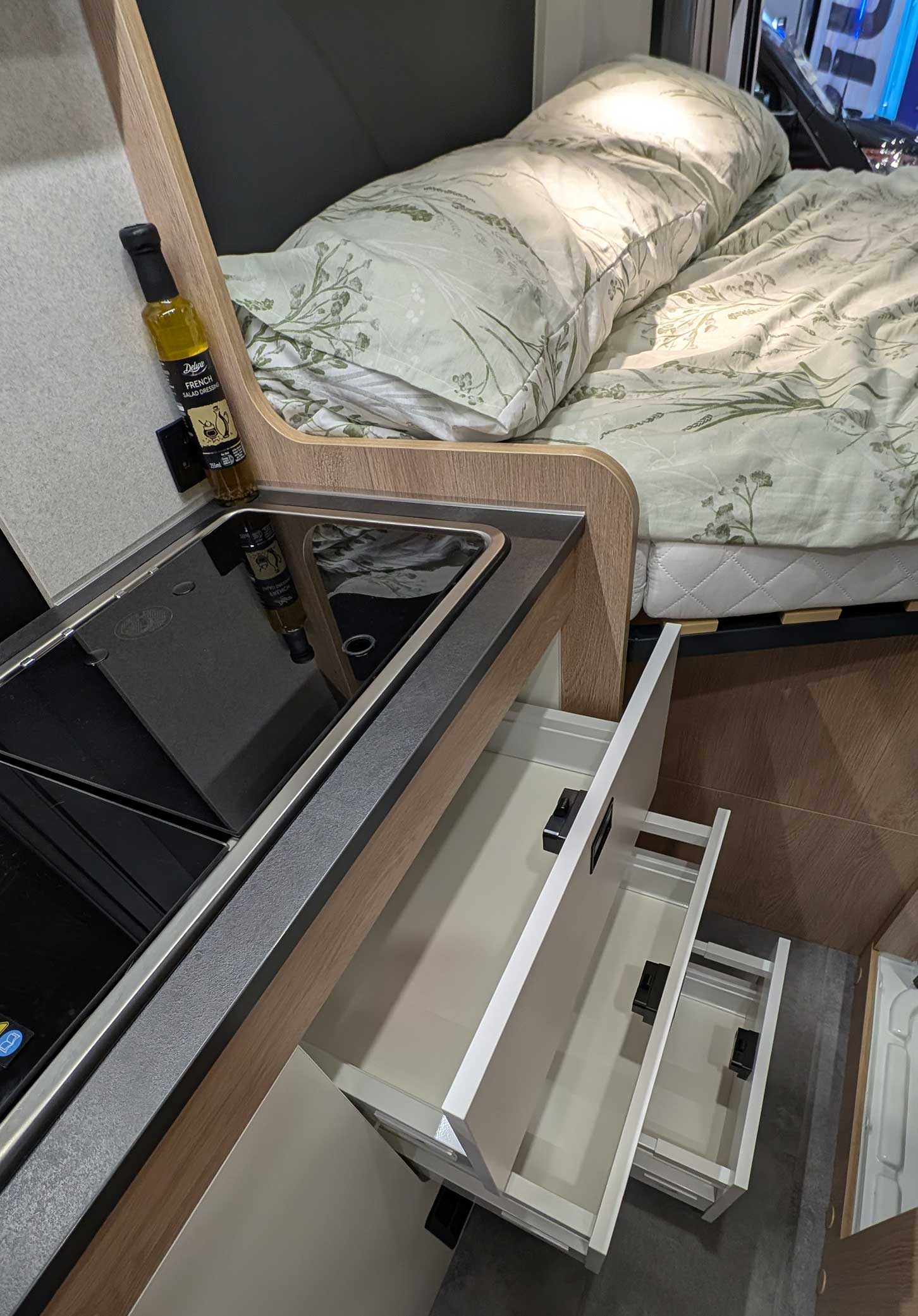 The 75QB comes with four travel seats, including the cab seats, a reversing camera, cruise control, alloy wheels, and 8-speed automatic transmission. You also get a 97-litre compressor fridge and a 95Ah leisure battery.