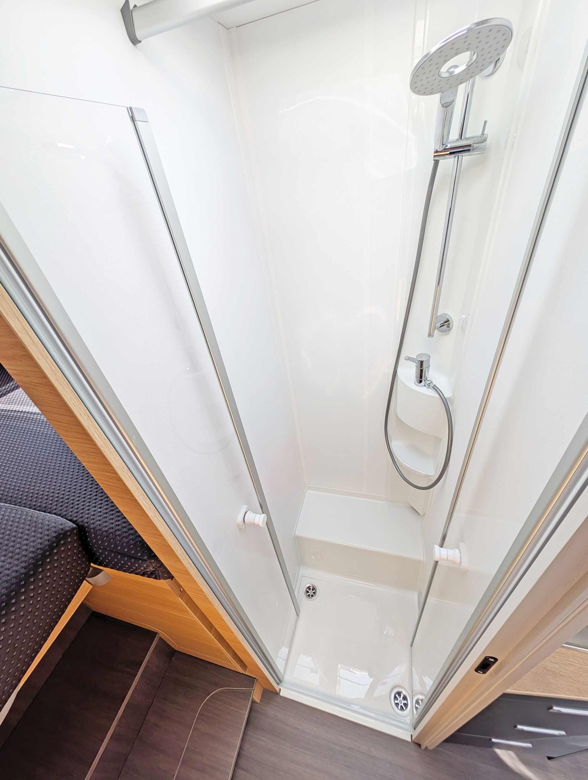 The shower cubicle in the central washroom is a bit encumbered by the wheel arch, especially as there is also a concertina door, but I thought it had good headroom. The motorhome also comes with two drain holes and a vent.