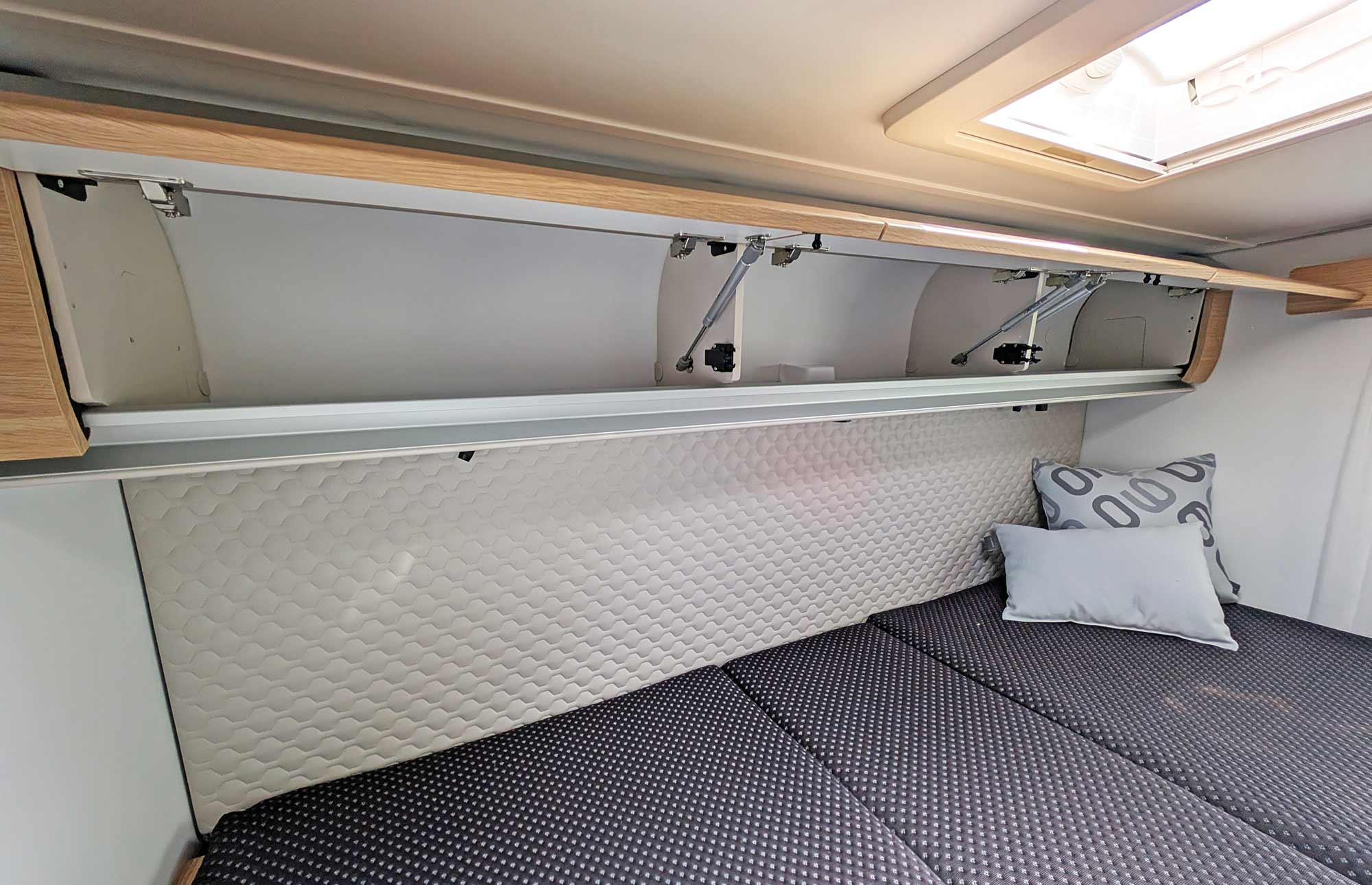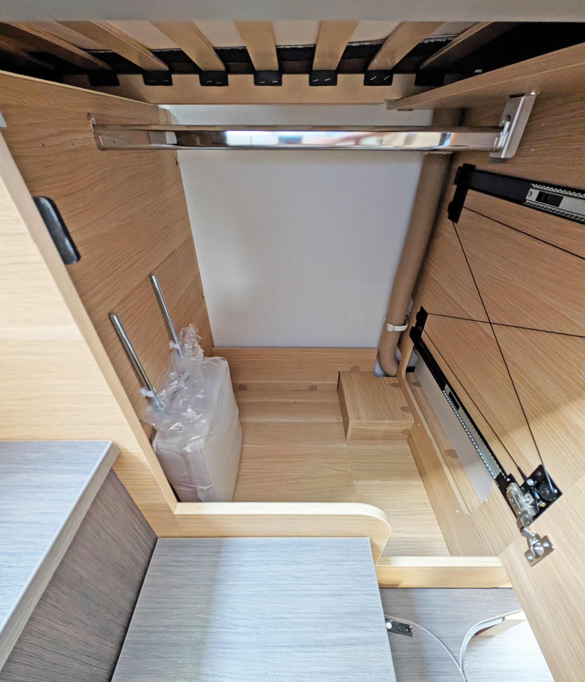 Inside the ’van, the largest storage areas are the wardrobes under the beds, but you can’t access these by lifting the slats, and the doors, opening towards the front, may get in the way.