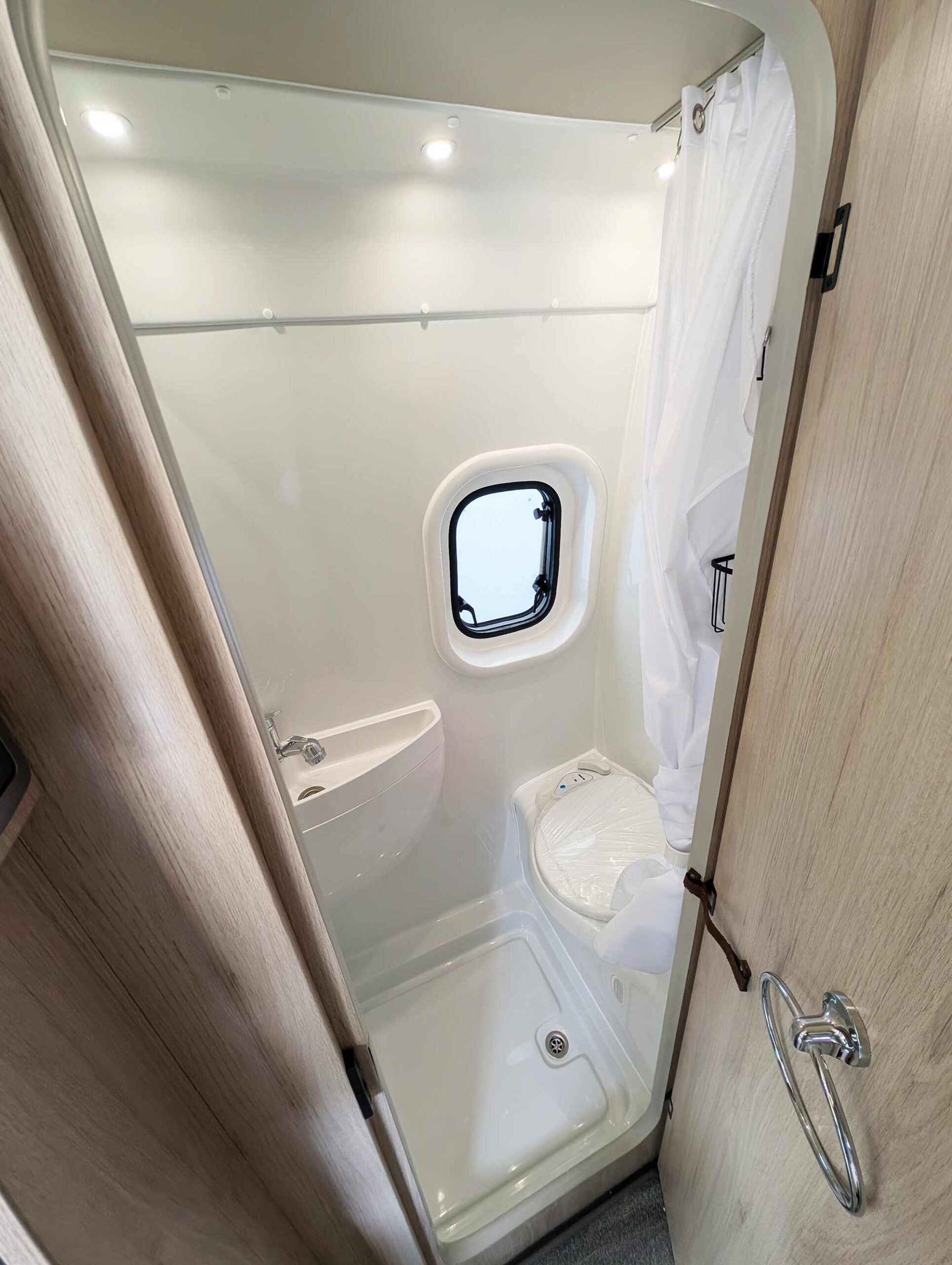 If you were wondering, “do campervans have showers?”, you will be pleased to hear that while the washroom is quite basic, a shower pulls out from the tap in the tiny basin. The washroom also provides a decent lit mirror and good headroom.