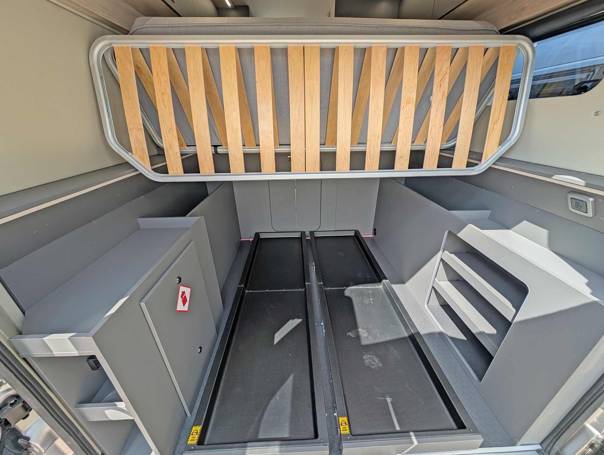 The main ladder, which accesses the roof bed if you opt for it, can be folded up to stay in position in the hatch if you don’t need to go up there during the day, and are on the move.