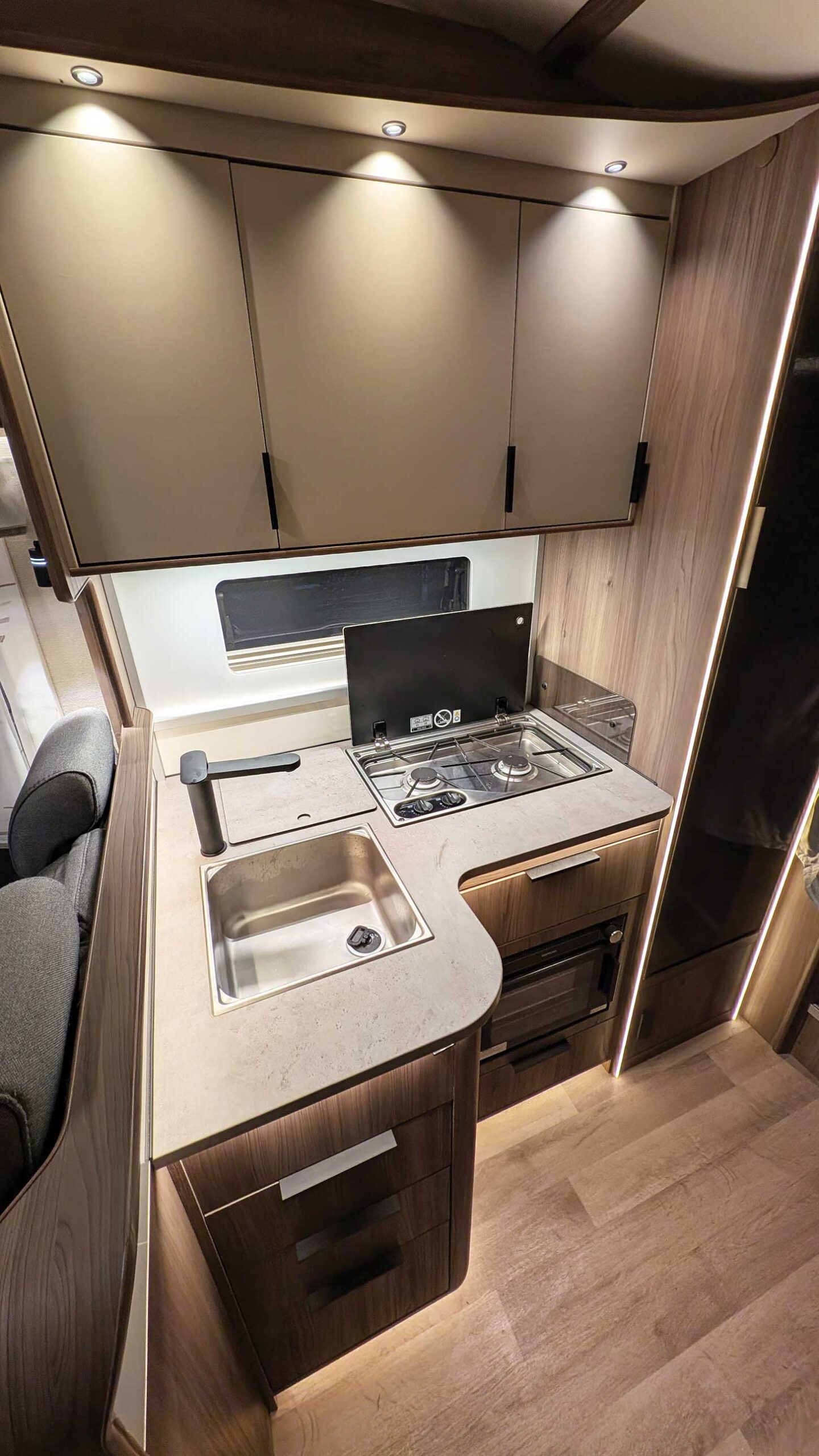 So that’s all positive, but the kitchen in the Sportivo could only be described as adequate, with a gas-only two-burner hob, only a combined oven and grill and no space for a microwave.