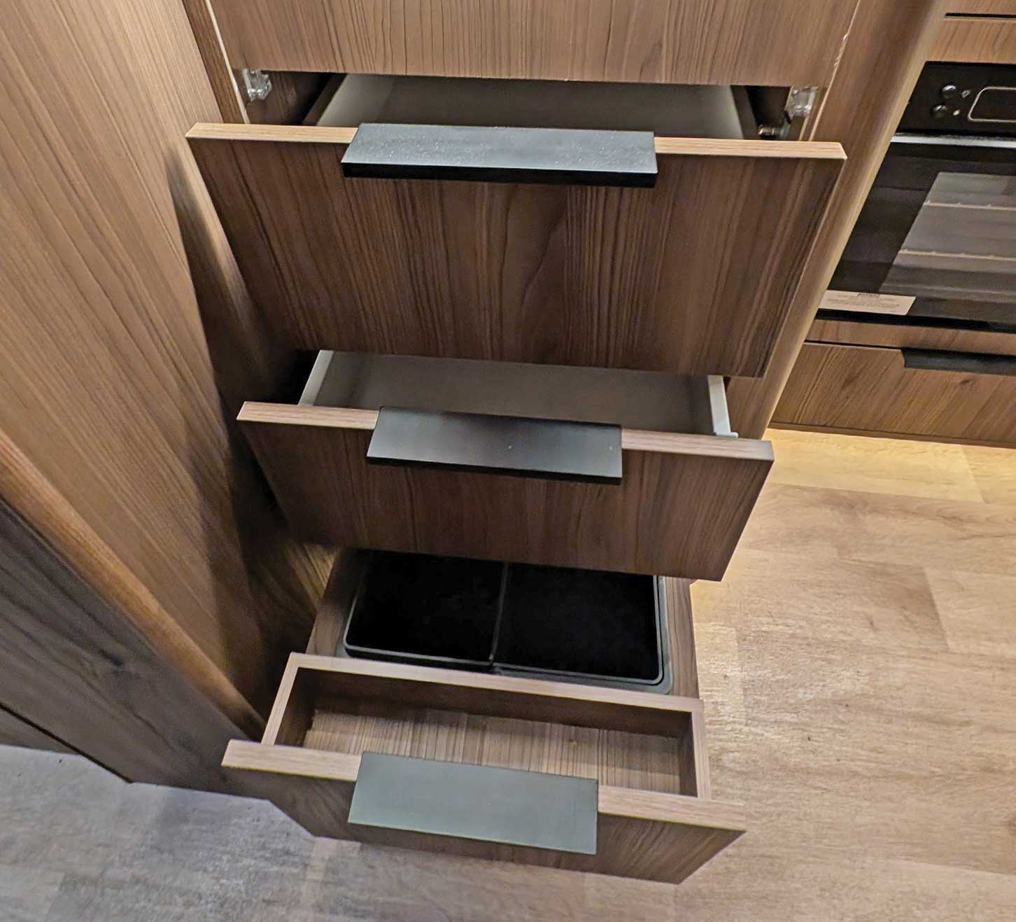 oven and grill, high-gloss worktop, lockable drawers, integrated waste bins, extractor fan