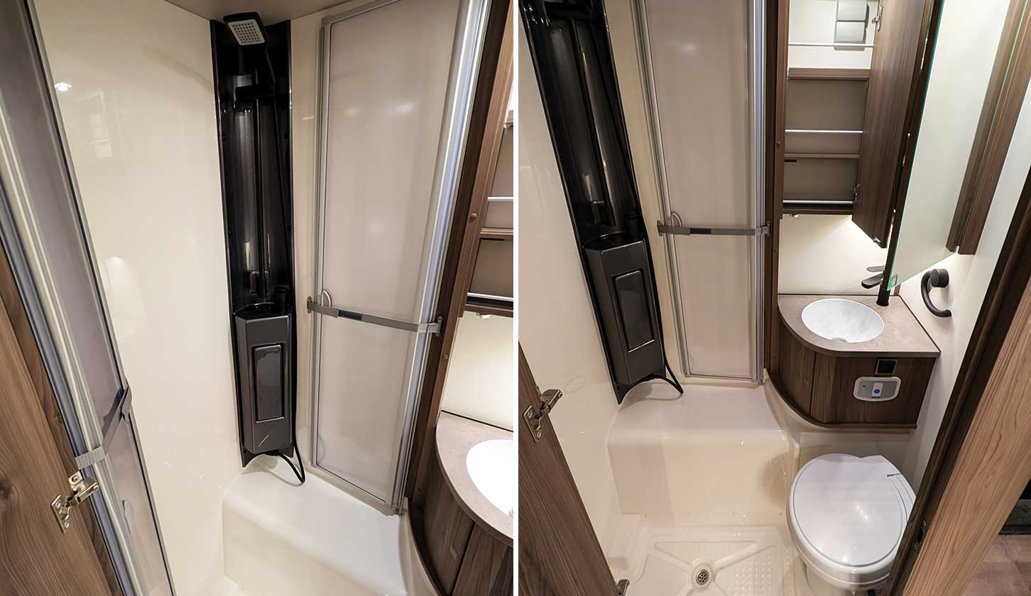 The smaller size of motorhome and weight also come into play with the washroom. Unlike Coachman’s Travelmaster and Avventura, the washroom here is not sprawled across the full width of the motorhome – it is all on one side (the nearside, which accounts for why the cassette loo access is so close to the main door).