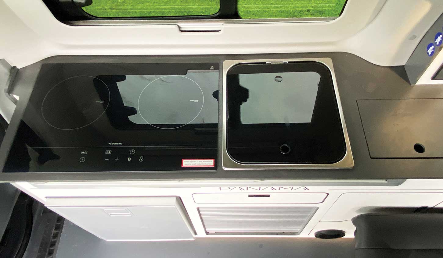 To the left is the kitchen’s headline act, its gas-free induction hob with touch controls, comprising a 1000W and 1200W option.