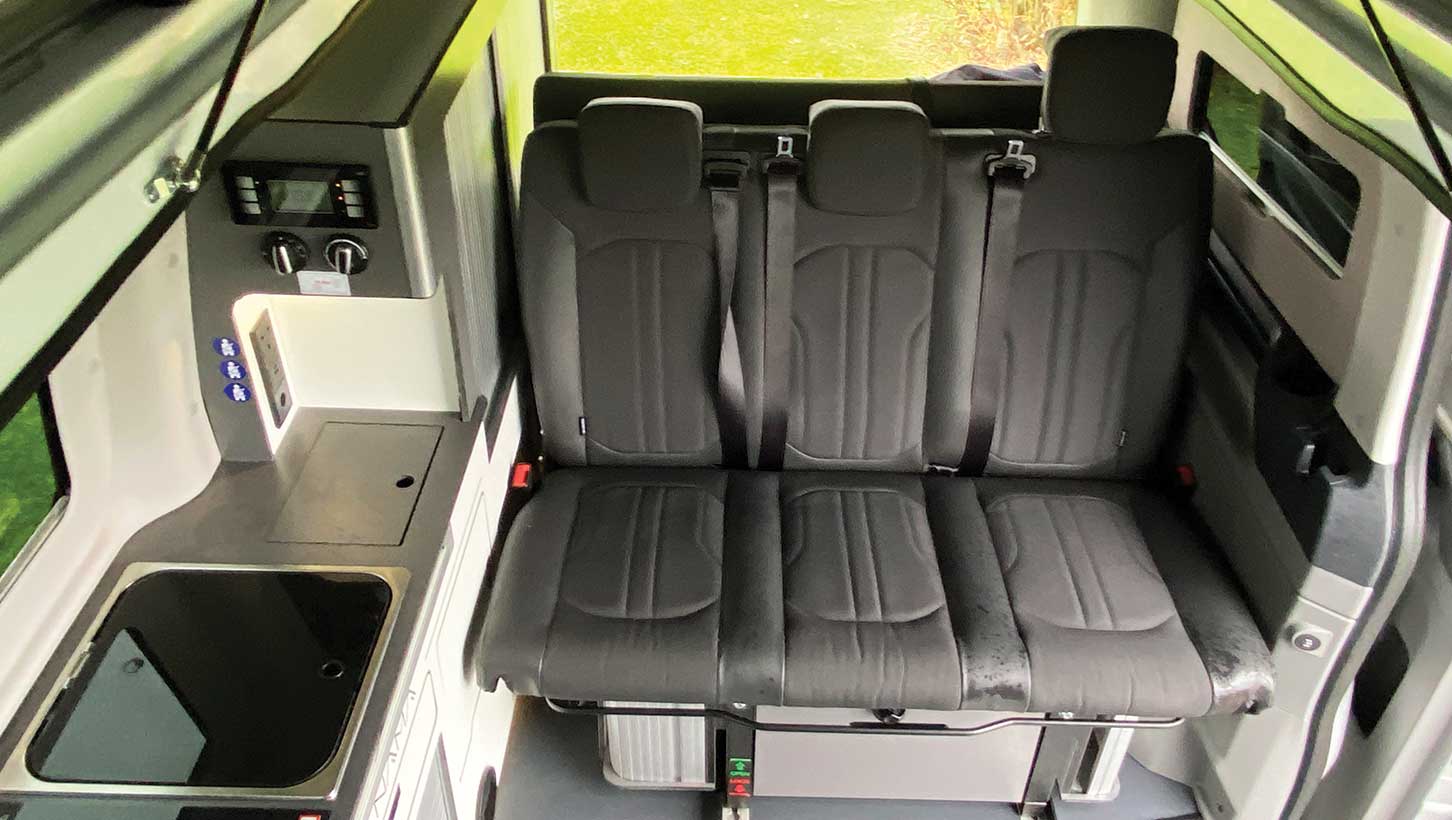On the floor is the sliding floor track that the rear seating system uses, allowing you to adjust the position of the bench seat. This is great when travelling with passengers in the back, making the ’van feel more like a people carrier with the added bonus of creating a huge boot space. It also means you can all sit around the table without needing to stretch too far.