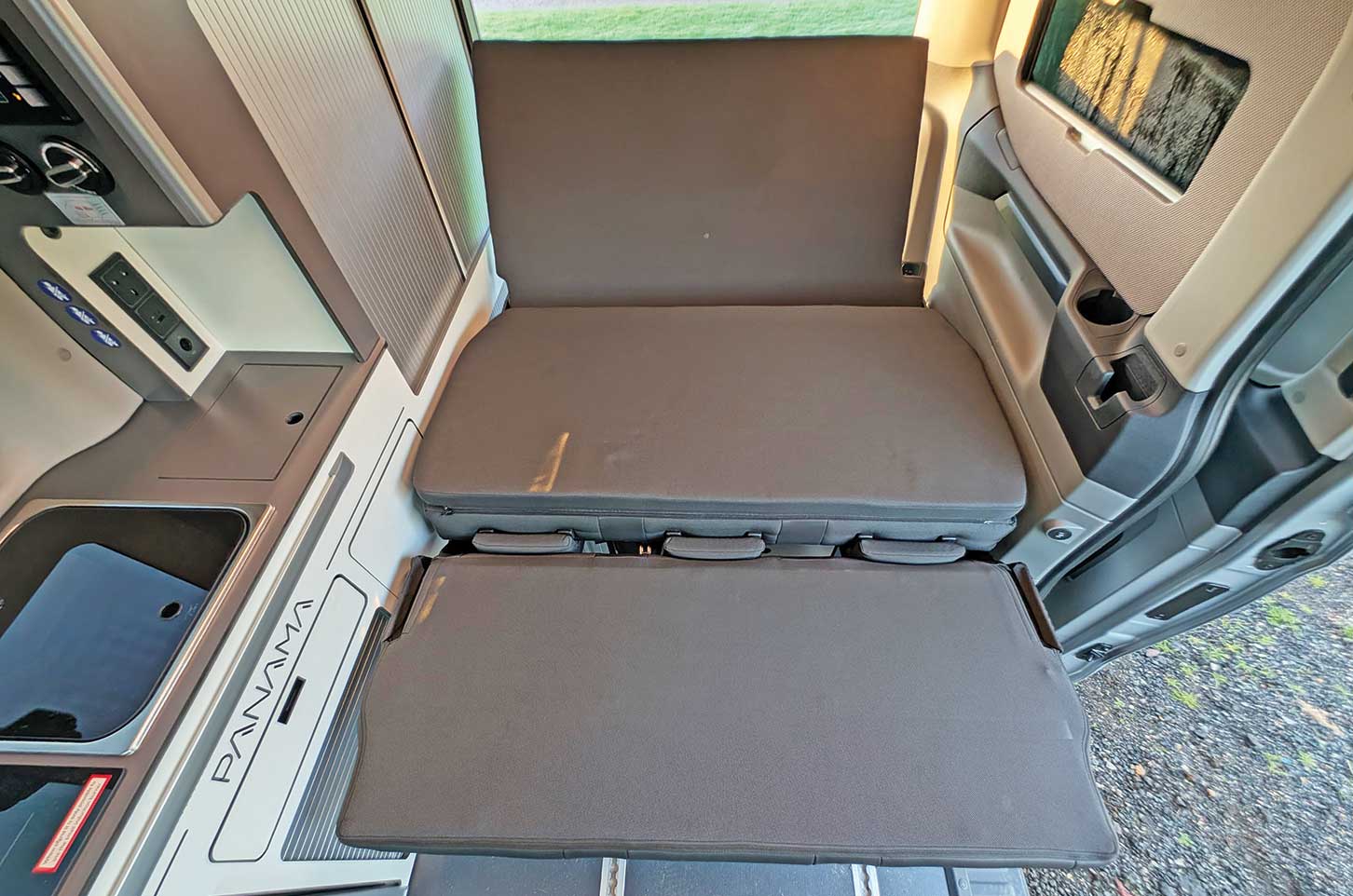 Although there are five travel seats (with two ISOFIX points), the Panama offers four berths for sleeping. The bench seat uses the sliding floor track system to become an 1890 x 1140mm rock‘n’roll bed. You aren’t expected just to lie on the folded down seats, because a mattress topper folds over to provide a very smooth and comfortable surface.