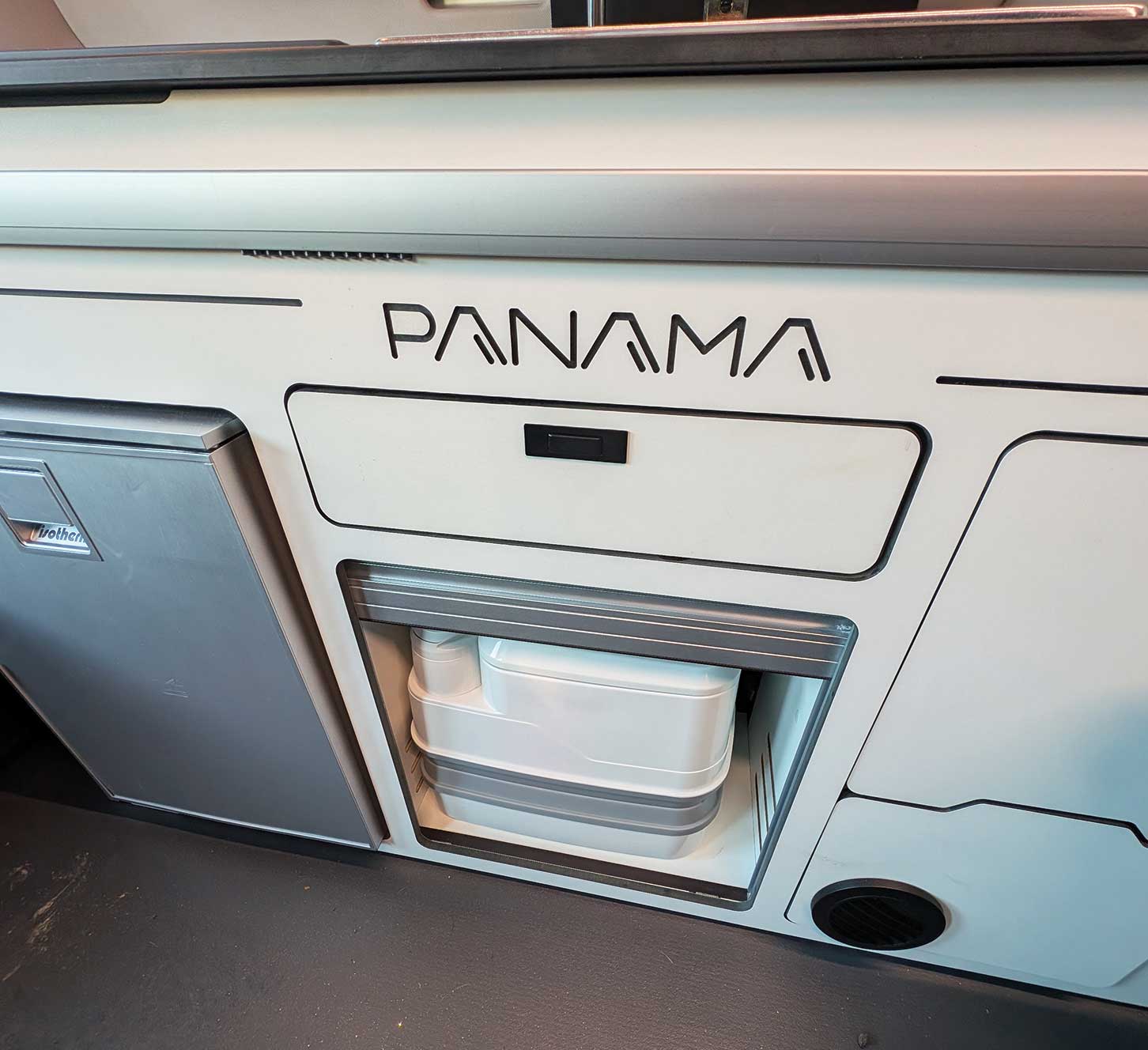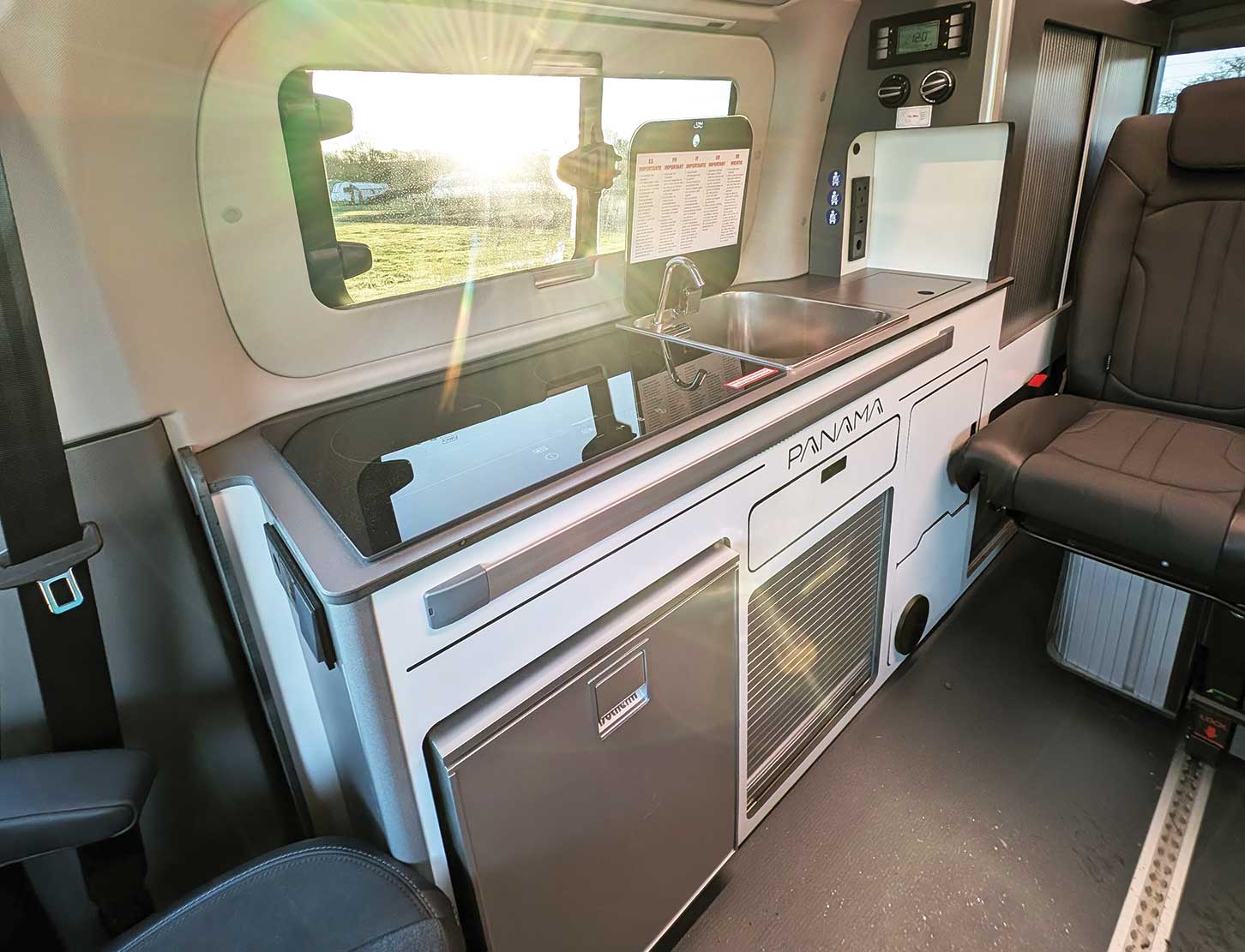 When you’re choosing the right size of campervan for you, there will always be pros and cons to consider. Unsurprisingly for a more compact model, the Panama P\10E asks its users to compromise on kitchen space. To remedy this is a good-sized fridge with a freezer compartment (5) along with a stainless steel sink and cold water tap, finished with a black glass lid.