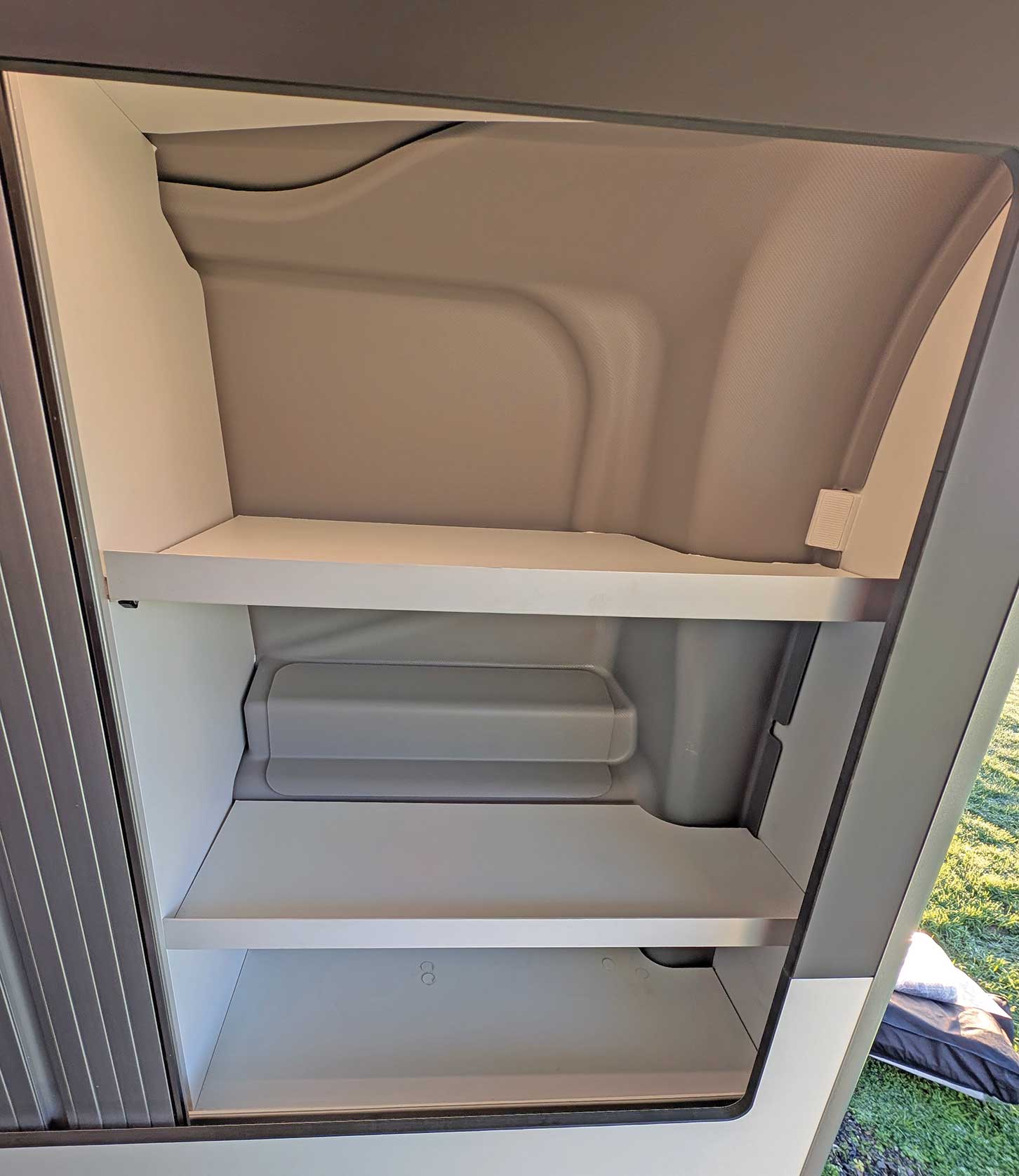 Even with the bench seats pushed all the way back, there is a decent amount of boot space, so you will have plenty of room to pack your favourite campervan gadgets. There is a main sliding-door locker split into two sections, along with two under-seat side cupboards running the length of the bench, both of which are closed off with tambour doors and can be accessed from the rear and the living area.