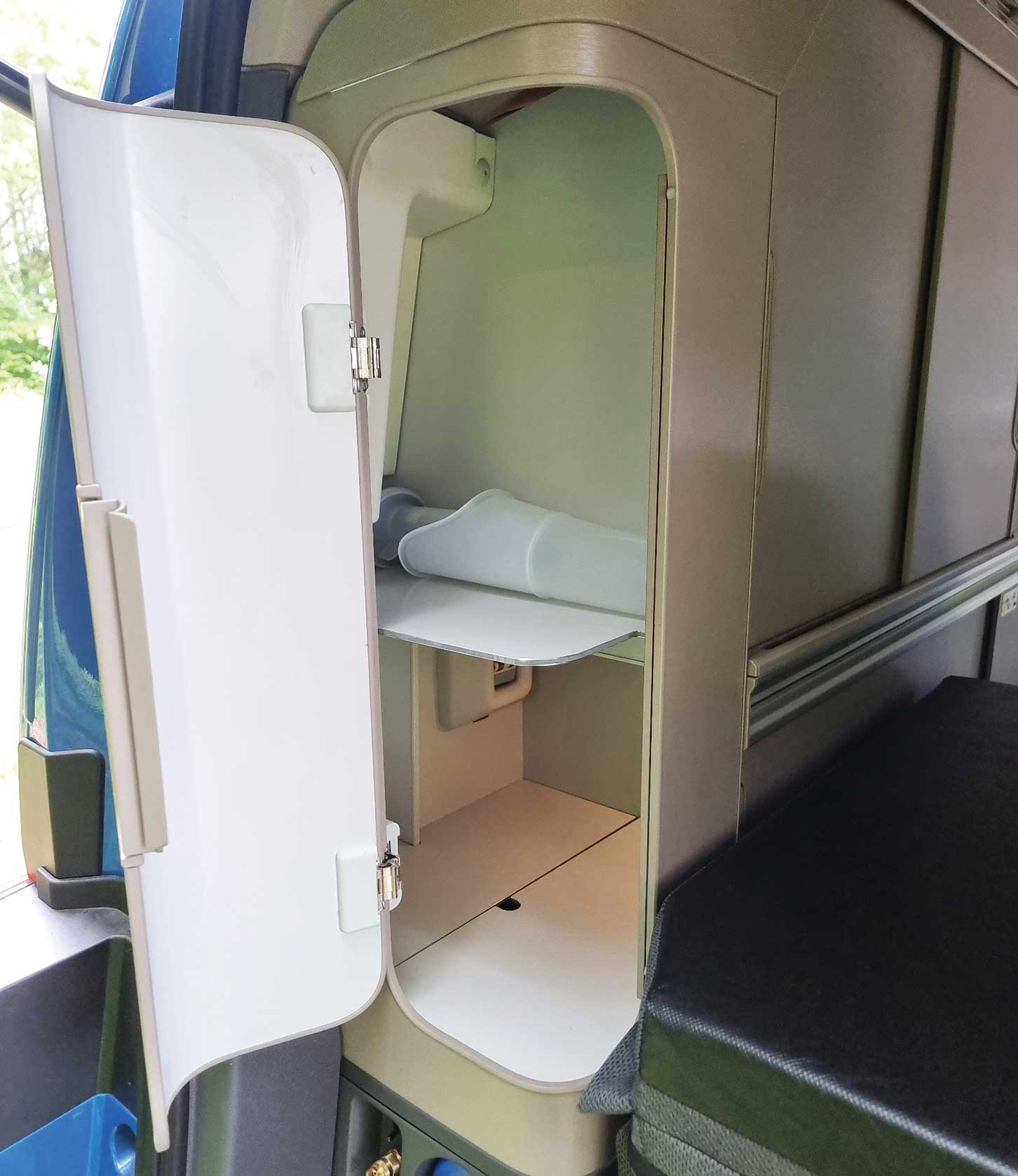 The campervan fridge is a decent size, with variable temperature settings. It’s below the hob by the nearside door, making it easy to grab a cold beer from inside or outside the vehicle.
